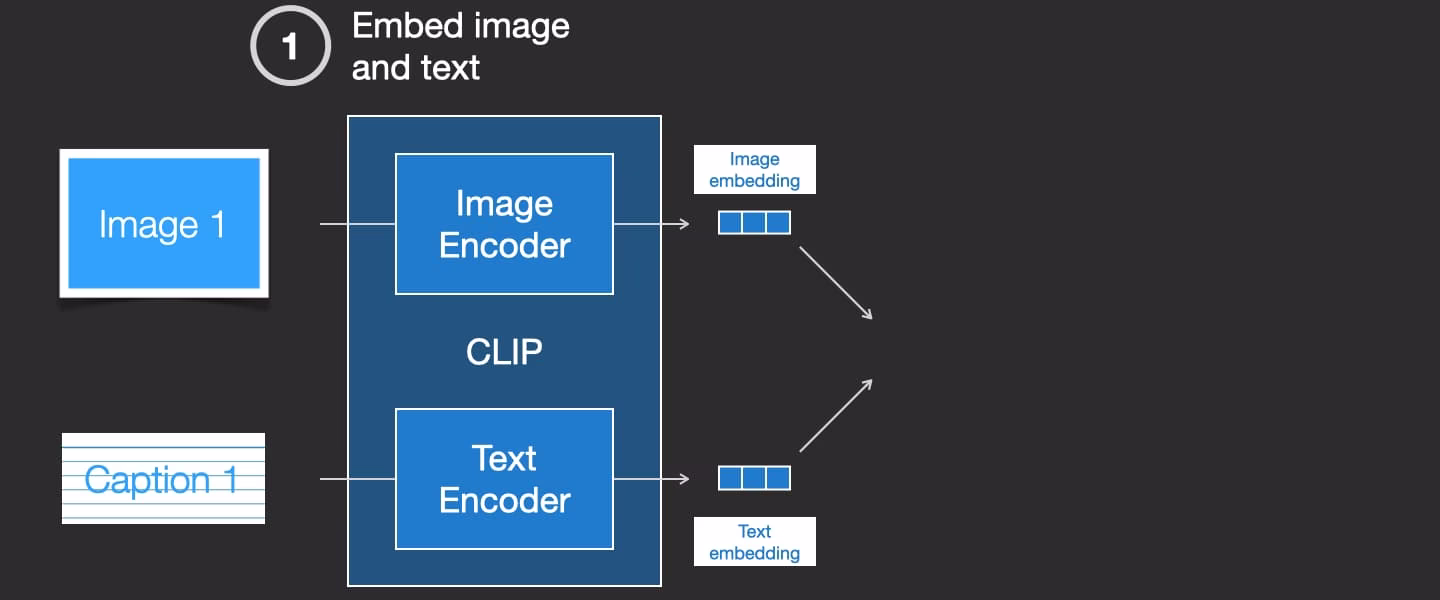 CLIP - это сочетание кодировщика изображений и кодировщика текста. Обучающий процесс модели можно упрощенно представить как кодирование изображения и его подписи кодировщиками изображений и текста.